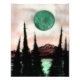 Tall Evergreen trees standing straight and to the left and to the right in this fantasy landscape painting by artist Jason Girard from green to brown colours throughout the work with grey to very dark colour foreground with mountain range in the background.