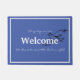 Plush door mat is shown in medium blue and has a white border and text. Text reads " Every day we rise," " Welcome" in bold print in centre and " we choose to serve the Lord our GOD". Outlined image of a dove behind the word 'Welcome'.