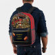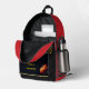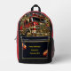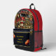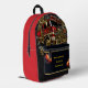 This custom backpack features A close-up illustration of a red firetruck, with gold accents, surrounded by flames. symbolizing bravery and heroism,