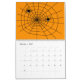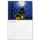 A calendar with a scary, spooky, or Halloween-theme; features different types of scary, but cute animals, sights, and objects commonly associated with spooky or Halloween