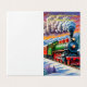 Step into a winter wonderland with our whimsical Christmas card featuring a classic steam locomotive chugging through a snow-covered landscape. Adorned in deep green and red, this charming train releases puffs of white smoke against a breathtaking sky painted with beautiful shades of orange, pink, and purple—a scene perfect for the holidays. Surrounded by snow-laden trees, majestic mountains, and a festive atmosphere, this card encapsulates the joy and magic of the Christmas season.