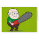 This is a cartoon illustration of an older bold man who's looking kinda angry at his chainsaw. Let's hope he's only planning on cutting down a tree and nothing more evil!