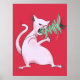Funny Christmas poster with a hilarious digital illustration of an evil white fat cat eating a Christmas tree on vibrant red background. You know what happens on Christmas every single year. Cats love to ruin holiday decoration.