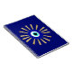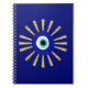 Gorgeous blue notebook printed with a large Evil Eye symbol, surrounded by a golden sunburst. Eye-catching and full of positive energy.
