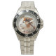 Has heft and feel of expensive stainless steel quartz watches. Good band with safety catch. I removed links, which is easy because engraved arrows show direction to push the linking pins. As always by this seller, the image (a railroad logo) is a perfect reproduction of my emailed image, and is precisely spaced and aligned.