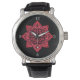 This dramatic wrist watch features a black face with grey numbers and a stunning red medallion.