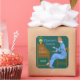 This personalized bookplate has a vintage stencil look. A woman in a blue dress sits at a writing desk with pen raised while a lamp shines next to her. The background is dark teal. The woman looks like she is from the 19th or early 20th century. The design has a modern Art Deco feel with squared lettering. The desk says, "Ex Libris," meaning "from the books / from the library of" in Latin.
