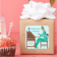 This personalized bookplate has a vintage stencil look. A woman in a turquoise blue dress sits at a writing desk with pen raised while a lamp shines next to her. The background is light mint green-blue. The woman looks like she is from the 19th or early 20th century, with dark skin and brown hair. The design has a modern Art Deco feel with squared lettering. The desk says, "Ex Libris," meaning "from the books / from the library of" in Latin.