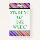 This exciting, positive badge design features the message "STUDENT OF THE WEEK!". A badge like this might be used to help encourage a student. [~Z0000317]
