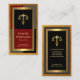 An artistic gold frame border design. The top black layer has a gold scales of justice logo with an underlying pen nib design. This is followed by your prestigious name, job title and a slogan caption "The Lawyer's Pen Is Mightier Than The Sword" in the corresponding red layer. Change the caption remarks to suit your service needs.
