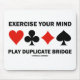 Playing duplicate bridge is a mental workout in and of itself. Showcase wry duplicate bridge attitude with any of these gifts with the bridge truism saying "Exercise Your Mind Play Duplicate Bridge". Includes all four card suits. No matter how often you exercise your mind at the bridge table, showcase your mental fitness attitude with these timeless bridge saying gifts!