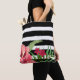 Simple black and white stripes and exotic pink flowers. Customizable tote bag template