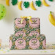 This playful exotic pink "Go Bananas!" happy birthday jungle wrapping paper features hand-drawn yellow banana bunches and tropical green banana leaves against a blush pink background with subtle raindrop detailing in a lighter pink. Personalize with a Heading (Happy Birthday, Happy Anniversary, Congratulations, etc.) and your name.