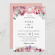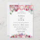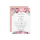 Beautiful exotic protea floral arrangements in chic shades of pink and purple, wedding invitation. Back of card features solid sunset pink colour.