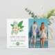Watercolor painting tropical foliage aloha beach wedding save the date photo announcement card customizable to your event specifics. Should your names look a bit off-centred when entered, "Click to customize further" (the blue link at the bottom of "Personalize this template") to easily adjust in the design area.