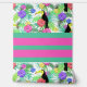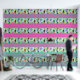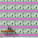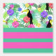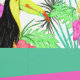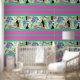 A bold modern tropical flowers and bird peel and stick wallpaper design with bold colours of aqua, green, and red violet. A stunning modern style for a tropical feel, combining tropical elements and horizontal stripes.