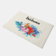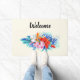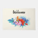 Welcome door mat with a vibrant and beautiful tropical flower bouquet. Orchids, hibiscus and tropical leaves. Pink, turquoise, red and blue colours.