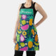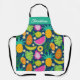 This is custom personalized apron featuring cute vibrant colourful tropical fruits with pineapple, papaya, dragon fruit, mango, banana, watermelon, and lemon with tropical leaves on dark background. You can change the name on the apron using personalize button.