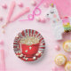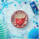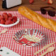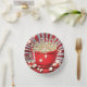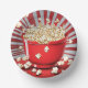 Popcorn exploding out of a red bowl with red and white starburst striped background
