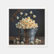 A shiny metal bucket is filled to the brim with freshly popped popcorn, with some kernels exploding in mid-air
