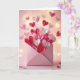 A pink envelope overflows with paper hearts in various shades of red, pink, and white, set against a softly blurred background with glowing lights.