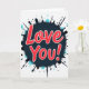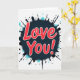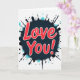 This greeting card puts “Love You!” front and center in rounded scarlet letters with a thin white outline. The words sit near the middle and look like they’re popping forward a bit, making the message easy to spot right away. Behind the text is a large, uneven dark navy splatter with sharp points and little droplets spreading outward. Around that main splatter, you’ll notice smaller bright cyan circles and light spray marks, plus a few jet-black dots and streaks. The white background stays open and simple, so the red message and dark splash stand out clearly. Overall, it feels energetic and affectionate, with a fun edge that still says “I care” ❤️. It’s a great pick for sharing love and appreciation on Valentine’s Day—send it along with a little extra warmth 💕.