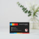Design features an elegant black as a background cover. There are two sets of accentuating columns with five colourful colours each at the top portion and floor of the card. This top colourful tab plays host to your name and job title. Right below are four white buttons that have all your contact details. Towards the right of this, is your logo option. The same colourful tab encapsulates the base of the card. Overleaf, you get the same design theme where you will notice that the column is now a colourful line with the same colours. Above this line, at the right wall, you will find your business details. Right below is your slogan-tagline option for you to personalize your card. You have another optional logo at the same location ; If you so wish to download your photo, the dimensions are 1,000 x 1,000 pix. This is a simple great card for everyone to use. Elegant, striking yet bold and youthful.