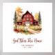 Exquisite Red Rustic Barn Classic Farmhouse Style Square Posters with Personalized Family Name & God Save This Home Quote in Whimsical Calligraphy in Red.