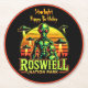 Three distinct aliens with green skin and large red eyes stand prominently, illuminated by a dramatic sunset behind them. In the backdrop, flying saucers hover above a forest, contributing to the otherworldly atmosphere of Roswell Nation Park.