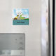 This funny geocaching design custom name refrigerator magnet has a cartoon with a geocacher reaching and saying, "It should be behind this bush. I'll be the FTF. Woo-hoo!"