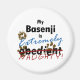 My Basenji is Extremely NAUGHTY! Obedient is crossed out, and naughty written in. Funny Basenji gifts that dog lovers will find hilarious! The design also features mud splatters (with a silhouette inside), paw prints, and bite marks out of the word obedient.