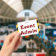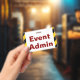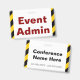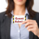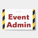 This eye-catching badge design features the message "Event Admin". It also features yellow and black coloured caution stripes. The back features a customizable event name and event date(s). [~Z0000286]