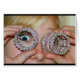 A closeup photograph of a person using fancy pink and white napkin rings as binoculars, with one eye showing, is the subject of my silly "Eye Love You!" card.