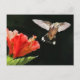 A hummingbird approaches a bright red hibiscus flower in order to get some nectar.