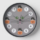 Cette horloge a beaucoup de fantaisie d'Halloween. Au centre il y a une paire d'yeux de chat vert et lumineux. Le visage du chat a aussi un nez rose et de longs whiskys noirs. Les douze, trois, six et neuf sont un jack-o-lanterne, qui est un chat noir à l'intérieur.