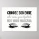 Trendy, black and white inspirational quote poster for her- Girly quote reads 'Choose Someone Who Ruins Your Lipstick, Not Your Mascara' in modern black and grey typography lettering. A pair of stylish, faux silver glitter eyelids with tons of mascara or fake eyelash extensions adorns the bottom. On solid white background, which may be changed to any colour you wish to match your decor. Note: All images are printed. Not actual glitter. Glam, girly gift for her. Perfect for a trendy teen girls bedroom, girly dorm decor, Sweet 16 birthday gift, or graduation gift for girls. Wouldn't this be an awesome poster displayed in a beauty salon or spa? Fun gift for a makeup artist, or even for a friend going through a breakup or divorce. We have coordinating makeup theme gifts and decor in our Zazzle.com/angela65* shop, as well as more girly gifts. Mix and match or collect them all!