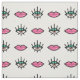 White fabric with a kitschy seamless pattern of glossy pink lips and blue eyes with yellow eye-shadow and long lashes.