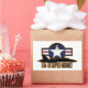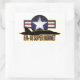 Sharp silhouette of the F/A 18 Super Hornet naval fighter jet aircraft backed by the United States military aircraft national roundel emblem