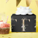 Letter F monogram floral. Letter F in golden brown texture accented with green watercolor compound leaves, flower blossoms and gold dust.