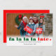 Avez-vous oublié d'envoyer votre carte de Noël à temps? Fa la la la late est la carte parfaite pour ceux qui sont toujours un peu en retard. Le recto de la carte comporte la phrase «Fa La La Late» dans les couleurs indiquées, ainsi que votre photo et votre message personnalisés. Vous pouvez modifier toutes les couleurs de ce design amusant et simple à l'aide de l'outil de personnalisation.
