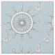 White ship's helm in centre with anchors and ropes in upper right and lower left corners. Medium blue background may be customized.