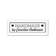 Timbre en caoutchouc avec le texte "Fait main" flanqué de deux coeurs et nom personnalisable ci-dessous.
