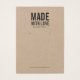 Carte d'affichage rustique kraft avec les mots "Fabriqué avec amour" en caractères gras et un script élégant pour votre nom ou nom de magasin en gris foncé est parfait pour les bijoux faits main ou vintages. Vous pouvez déplacer le calque "Guide des trous" vers le haut ou vers le bas selon vos besoins ou le supprimer. Personnalisez-le en remplaçant le texte de l'espace réservé. Pour plus d'options comme changer la police, sa taille et l'espacement entre les lettres cliquez sur le bouton "Personnaliser". *Veuillez noter que le filigrane Zazzle qui apparaît dans l'aperçu du zoom n'apparaîtra PAS sur le produit imprimé final. © Bois de rose et agrumes