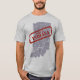 Un design graphique de style grunge d'une carte de l'Indiana et une impression de tampon avec le texte "Made in Indiana" de l'artiste-designer Charmaine Paulson sur un t-shirt gris masculin.