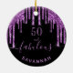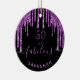 A trendy and glamorous 50th (or any age) birthday ornament. A classic black background decorated with dark purple colored faux glitter drips, paint dripping look. With the text: 50 and fabulous. Personalize and add a name. Purple colored text. The word Fabulous is written with a modern hand lettered style script with swashes. Perfect as a gift, party favor or as party table setting decoration.