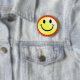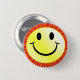 happy face buttons in original, traditional yellow with bold black features. Bright orange and yellow sun rays background. Put on a happy face with this funny bright happy button pin!