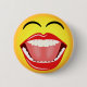 © Sunny Mars Designs Face Pin-Back Buttons – This cool, humorous, fun, novelty round button, badge or pin features a funny illustration of a yellow laughing face emoticon with an open big mouth, bright white pearly teeth, tongue and closed eyes. Concept for humor.