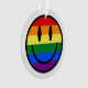 Cette oeuvre colorée présente un visage souriant arc-en-ciel.