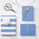 This set of wrapping paper sheets features a solid faded blue coloured sheet with coordinating sheets of wide faded blue stripes on white, and white polka dots on faded blue.