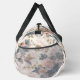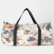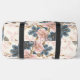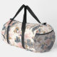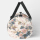 This image showcases a duffel bag adorned with a beautifully faded and intricate floral pattern, reminiscent of antique chinoiserie textiles. The design features a delicate arrangement of blossoms and ornate foliage in soft hues of dusty pink, muted blue, and warm beige, all set against a textured, light cream or off-white background. The overall aesthetic is one of classic elegance with a subtle, aged charm. Equipped with sturdy, dark-coloured straps and a secure zipper closure, this bag is a functional yet artistically designed accessory, perfect for travel, gym use, or adding a sophisticated, vintage touch to any ensemble.